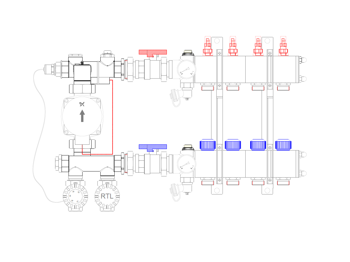 aanvoer retour met RTL-ventiel thermostaatknop dompelbuis (voor de afstandsvoeler van de thermostaatknop) Grundfos ALPHA1-circulatiepomp beveiligingsthermostaat (maximaalbeveiliging in aansluitsnoer pomp) aanvoerbalk verdeler retourbalk verdeler terugslagklep |