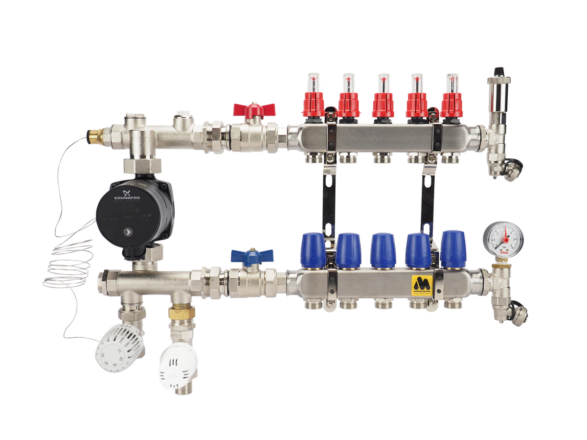 Deze meng-unit kan (tijdelijk) op de open verdeler worden aangesloten om de aanvoertemperatuur "terug te mengen" naar een temperatuur die geschikt is voor vloerverwarming.