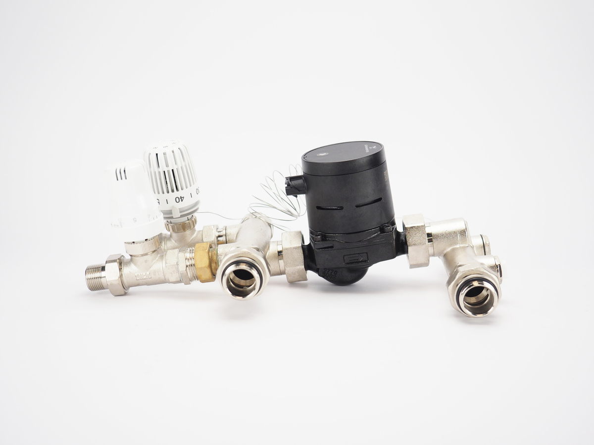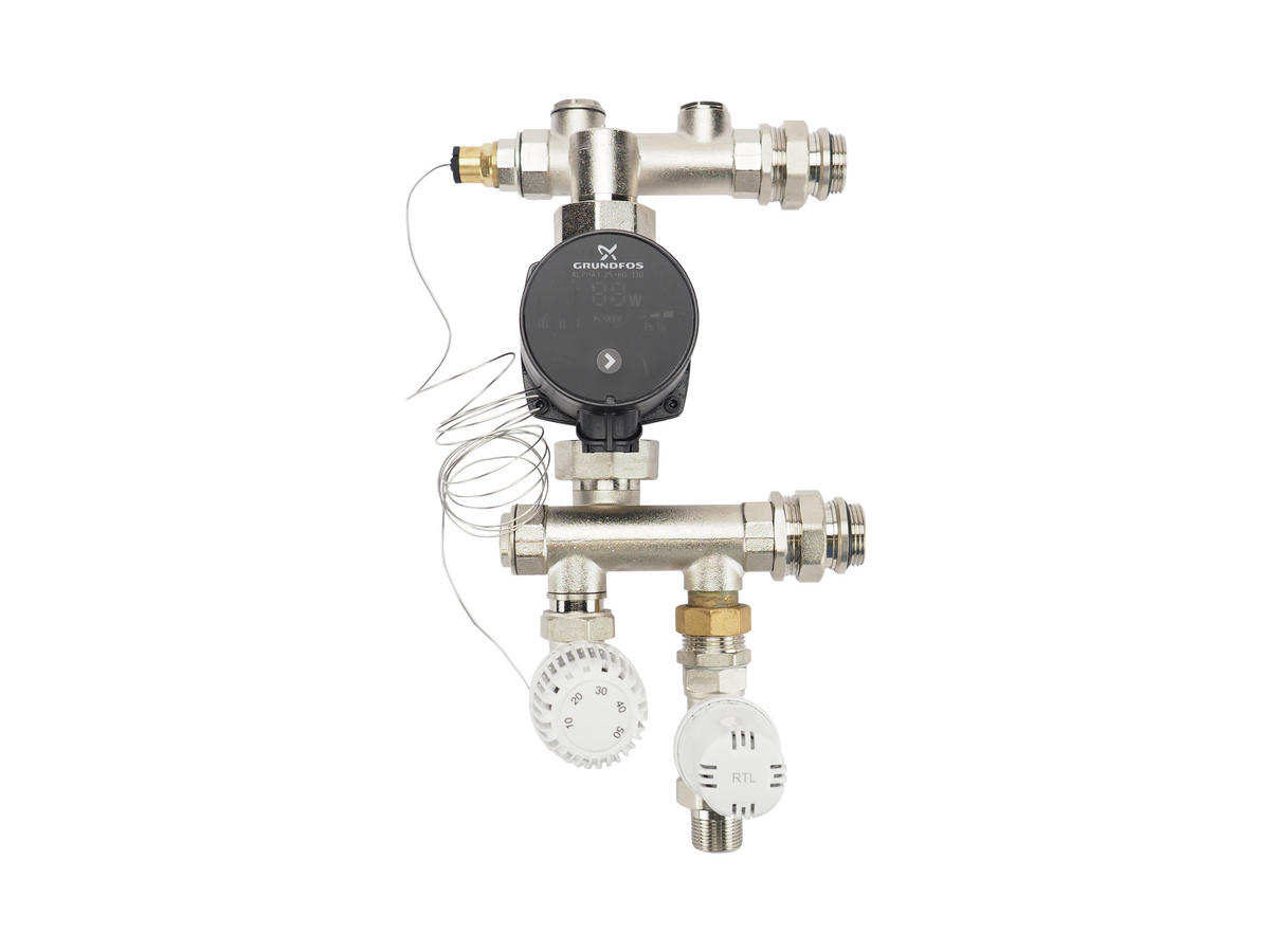De pompregelaar is standaard voorzien van de energiezuinige Grundfos ALPHA1- circulatiepomp en kan geïnstalleerd worden op alle soorten open verdelers met een hart-afstand van 210 mm tussen de aavoer- en retourbalk.
