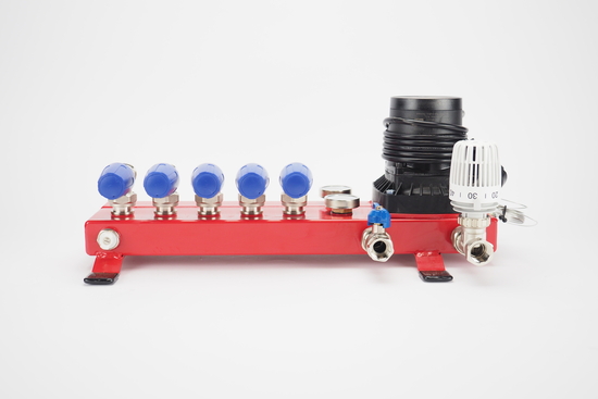 Deze verdeler is geschikt te maken voor laagtemperatuursystemen en is voorzien van een maximaalbeveiliging om te voorkomen dat te heet water de vloer in wordt gelaten.