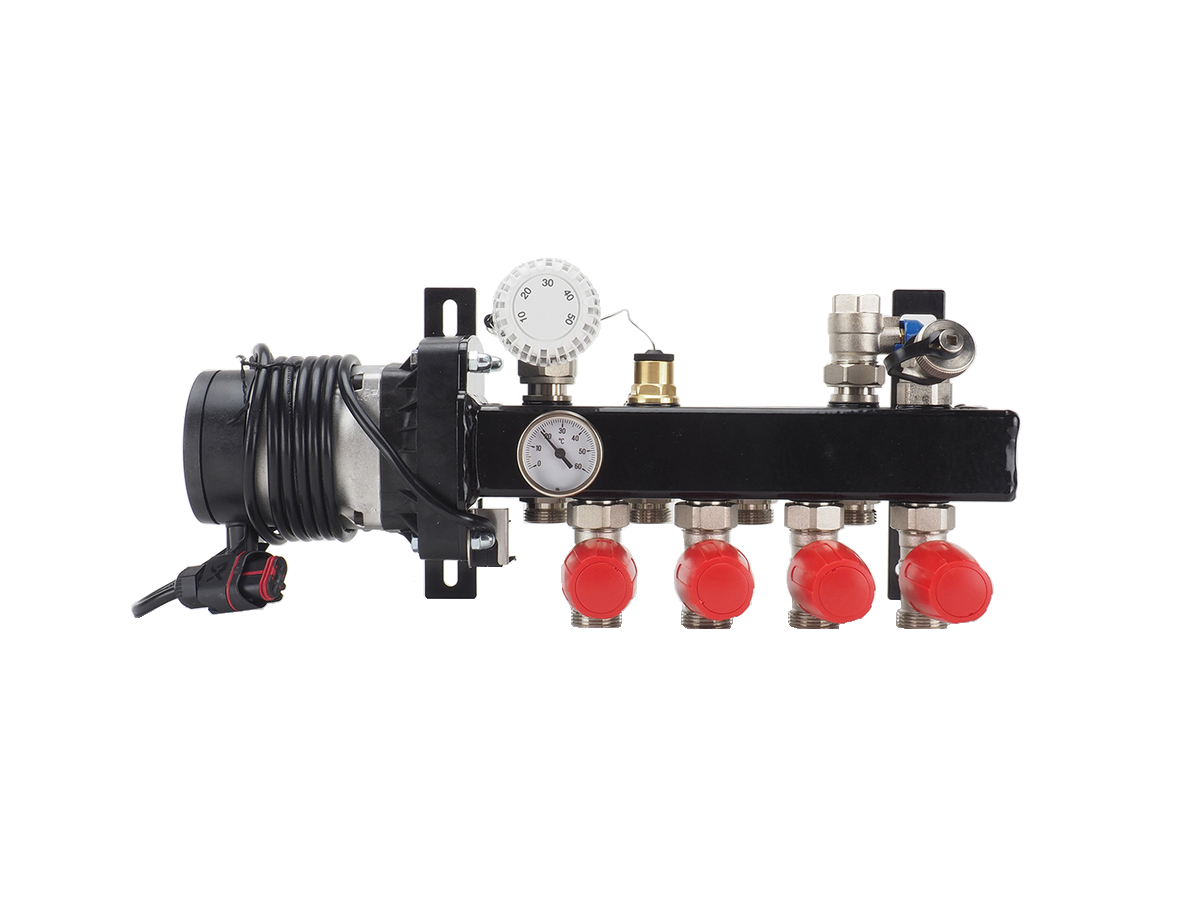 De standaard stalen verdeler bestaat uit een voorgemonteerde stalen constructie met circulatiepomp, temperatuurmeter en dubbel instelbare groepsafsluiters. Een van de voordelen van dit type verdeler is de minimale ruimte die nodig is en tevens is hij makkelijk te installeren.