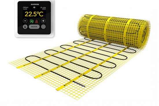 De verwarmingskabel is gelijkmatig bevestigd op een glasvezelnet (met een lus- afstand van ca. 10 cm). De isolatie van deze kabel is gemaakt van TEFLON en de beschermmantel is van PVC, daardoor is de verwarmingskabel zeer duurzaam en 100% waterdicht. Hierdoor zijn alle verwarmingsmatten geschikt voor installatie in geheel natte ruimtes. Daarnaast is de verwarmingskabel van deze mat voorzien van een unieke, blinde verbinding tussen verwarmings- en aansluitkabel.