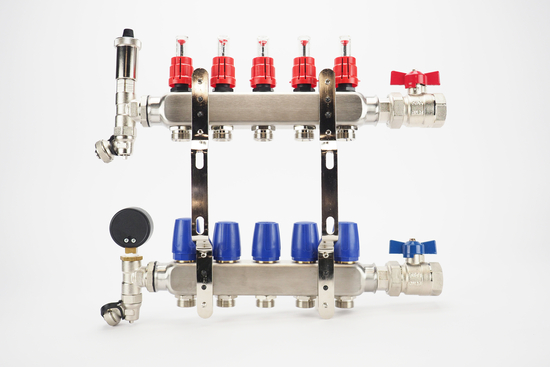 aanvoer met kogelafsluiter, 1" inregelbare flowmeter aanvoer vloerverwarmingsbuizen automatische ontluchter vulnippel retour met kogelafsluiter, 1" thermostatische afsluiter met M30 draad retour vloerverwarmingsbuizen vulnippel manometer waarop de druk in het systeem kan worden afgelezen |