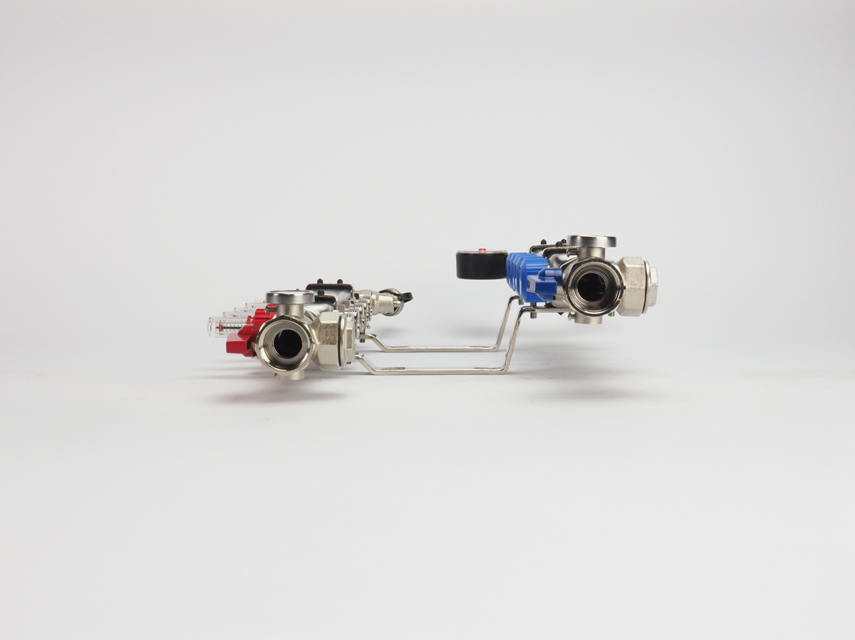 aanvoer met kogelafsluiter, 1" thermometer aanvoer inregelbare flowmeter aanvoer vloerverwarmingsbuizen handmatige ontluchter vul-/aftapkraan retour met kogelafsluiter, 1" thermometer retour thermostatische afsluiter met M30 draad retour vloerverwarmingsbuizen vul-/aftapkraan manometer |