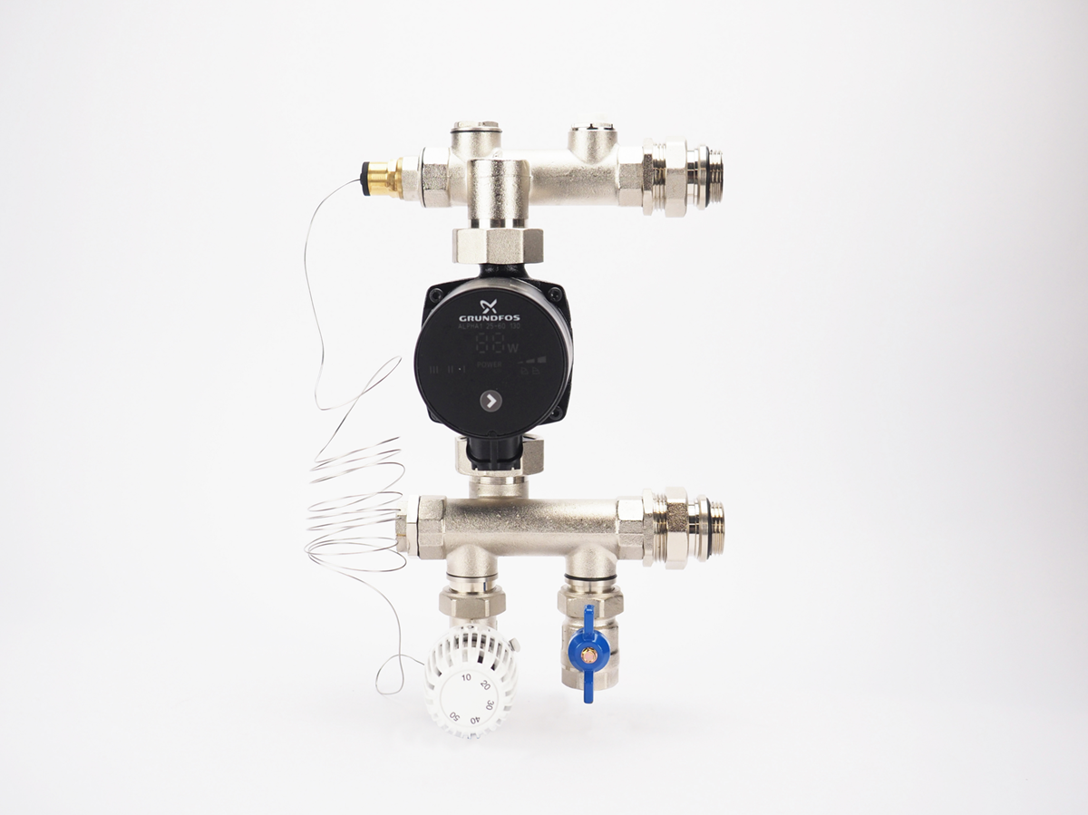 De regelunit is standaard uitgerust met een energiezuinige Grundfos ALPHA1 pomp.