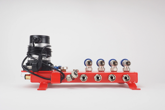 De stalen mengverdeler bestaat uit een voorgemonteerde stalen constructie met circulatiepomp, thermometer en dubbel instelbare groepsafsluiters.