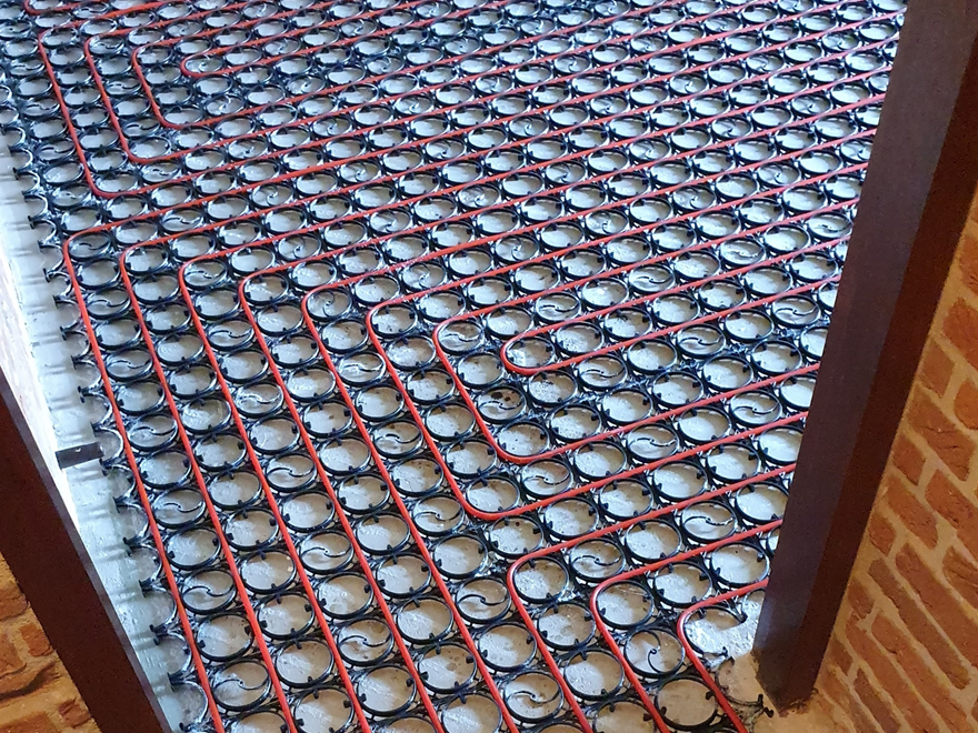 Wanneer dit systeem voor vloerverwarming gebruikt wordt, dan worden de buizen verwerkt in een egalisatiemortel van circa 17mm tot 22mm hoog.